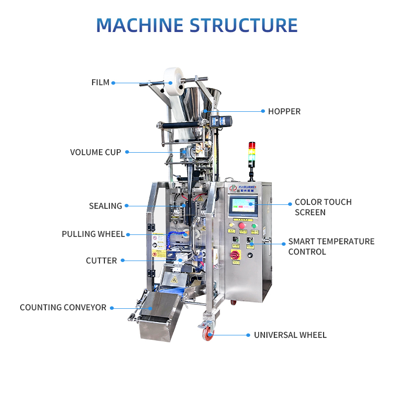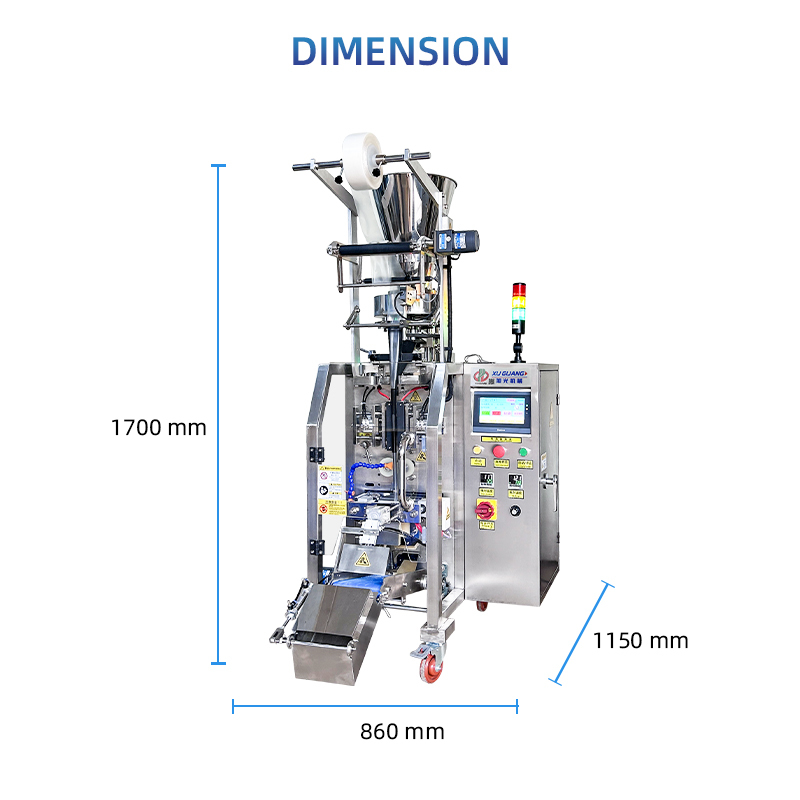 5.设备采用不锈钢机身,物料接触部分是食品级304不锈钢,防腐防锈。整机高1.7米,宽1米,长0.8米,可人工倒料,也可配上料机,上料方便,生产稳定设备能够连续稳定长时间工作,只要保证物料和包装膜充足即可。日常清洁、维护简单,料桶可拆分擦拭或直接清水冲洗,维护成本低。