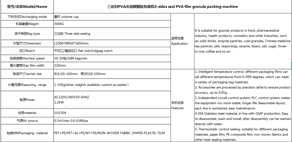 3-sides seal PVA film granule packing machine